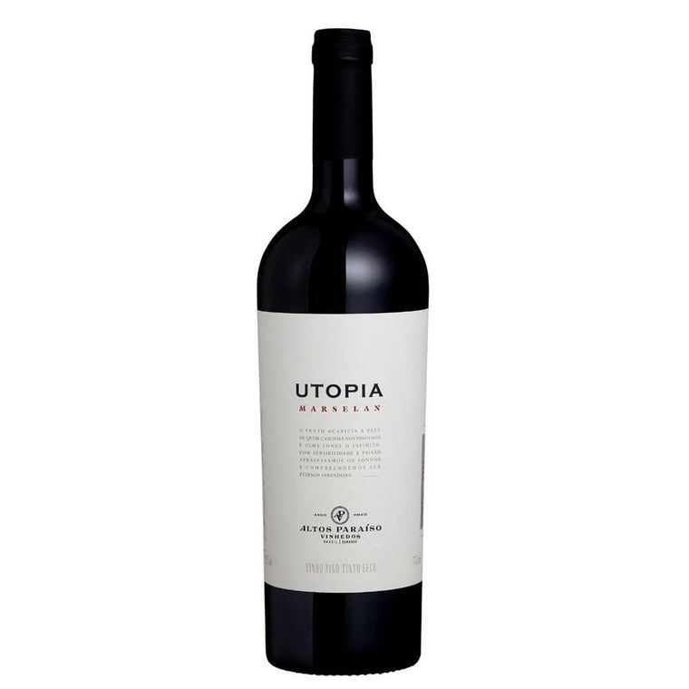 Vinho tinto Utopia da vinícola Altos Paraíso composto 100% por uvas Marselan da safra 2023, provenientes da Serra do Sudeste/RS. 67% do vinho maturou por 15 meses em barricas de carvalho. É aromático, equilibrado e persistente.