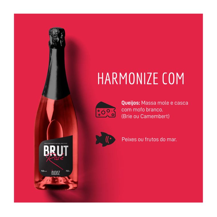 Harmonização: Harmonize com peixes e frutos do mar. O espumante Audaz Brut Rosé é perfeito para um jantar romântico