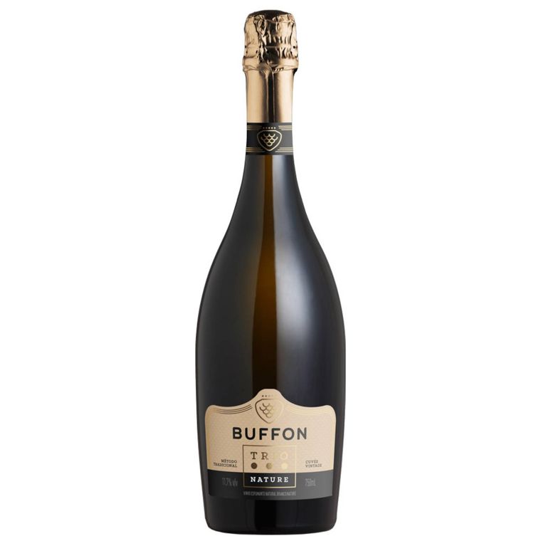 Espumante Branco Trio Nature da vinícola Buffon composto por uvas Chardonnay, Pinot Noir e Rieslig Itálico, provenientes da Serra Gaúcha/RS. Elaborado pelo método tradicional (champenoise), é um espumante leve, fresco e cheio de aromas frutados.