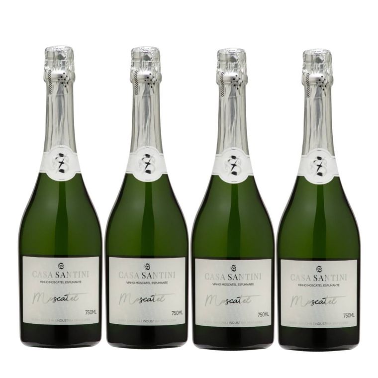 Kit contendo 4x unidades do Espumante Branco Moscatel da Vinícola Santini, composto por uvas Moscato Branco (80%) e Malvasia (20%). Elaborado pelo método Asti, trata-se de um espumante equilibrado, persistente e de bom volume em boca.