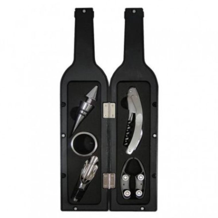 Este Kit Sommelier de 5 peças é o presente ideal para apreciadores de vinho, unindo design criativo e funcionalidade. O estojo, com acabamento emborrachado e formato de garrafa, abre-se para revelar um conjunto completo de acessórios essenciais para servir e degustar seus rótulos favoritos com sofisticação. Compacto e elegante, ele fica perfeito tanto na adega quanto à mesa.