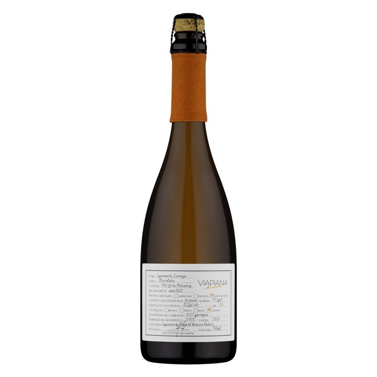 Este espumante Laranja Nature da vinícola Viapiana é composto 100% por uvas Gros Manseng da safra 2020, oriundas de Flores da Cunhas/RS, na Serra Gaúcha. Elaborado pelo método tradicional (champenoise), possui 16 meses de autólise.